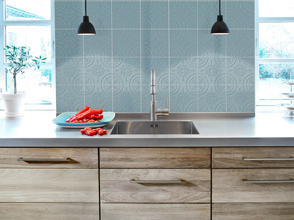 Pressed metal meets porcelain tile.