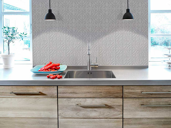 Pressed metal meets porcelain tile.