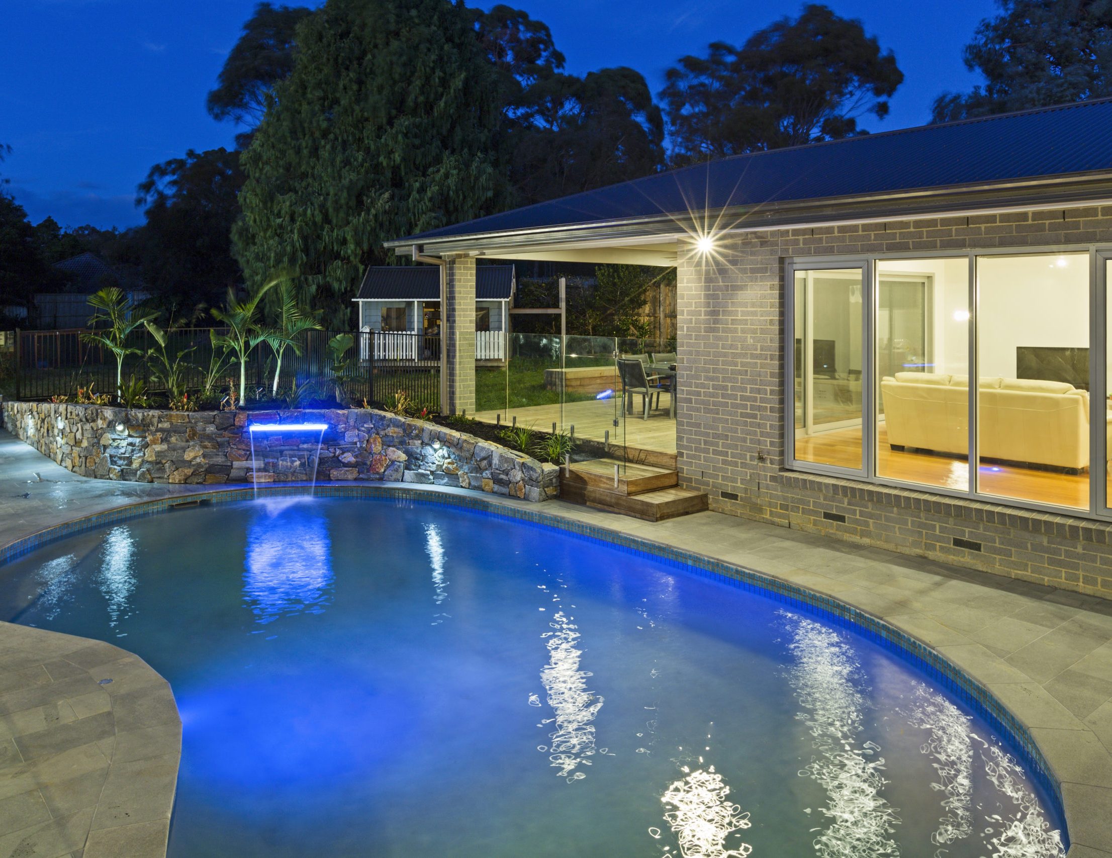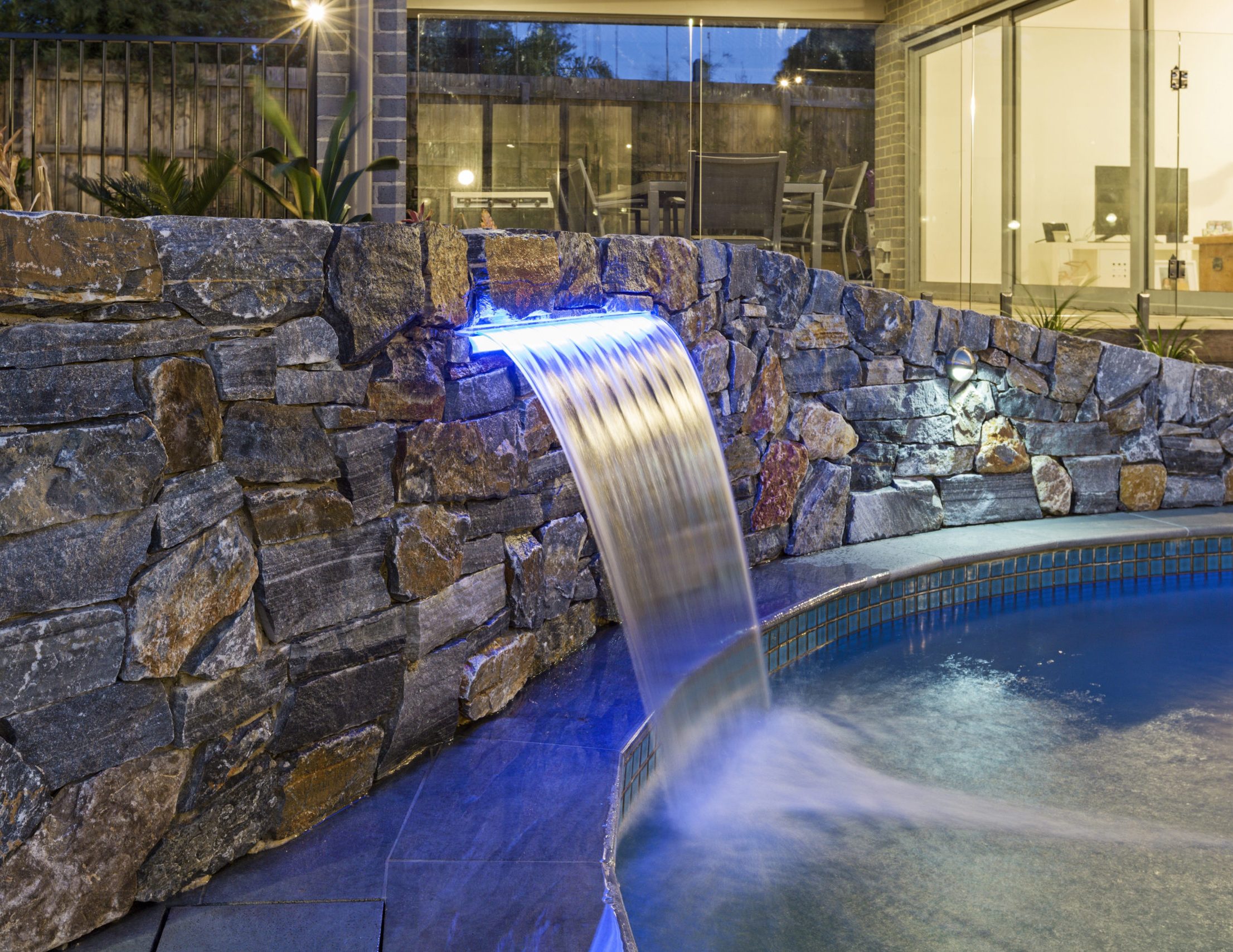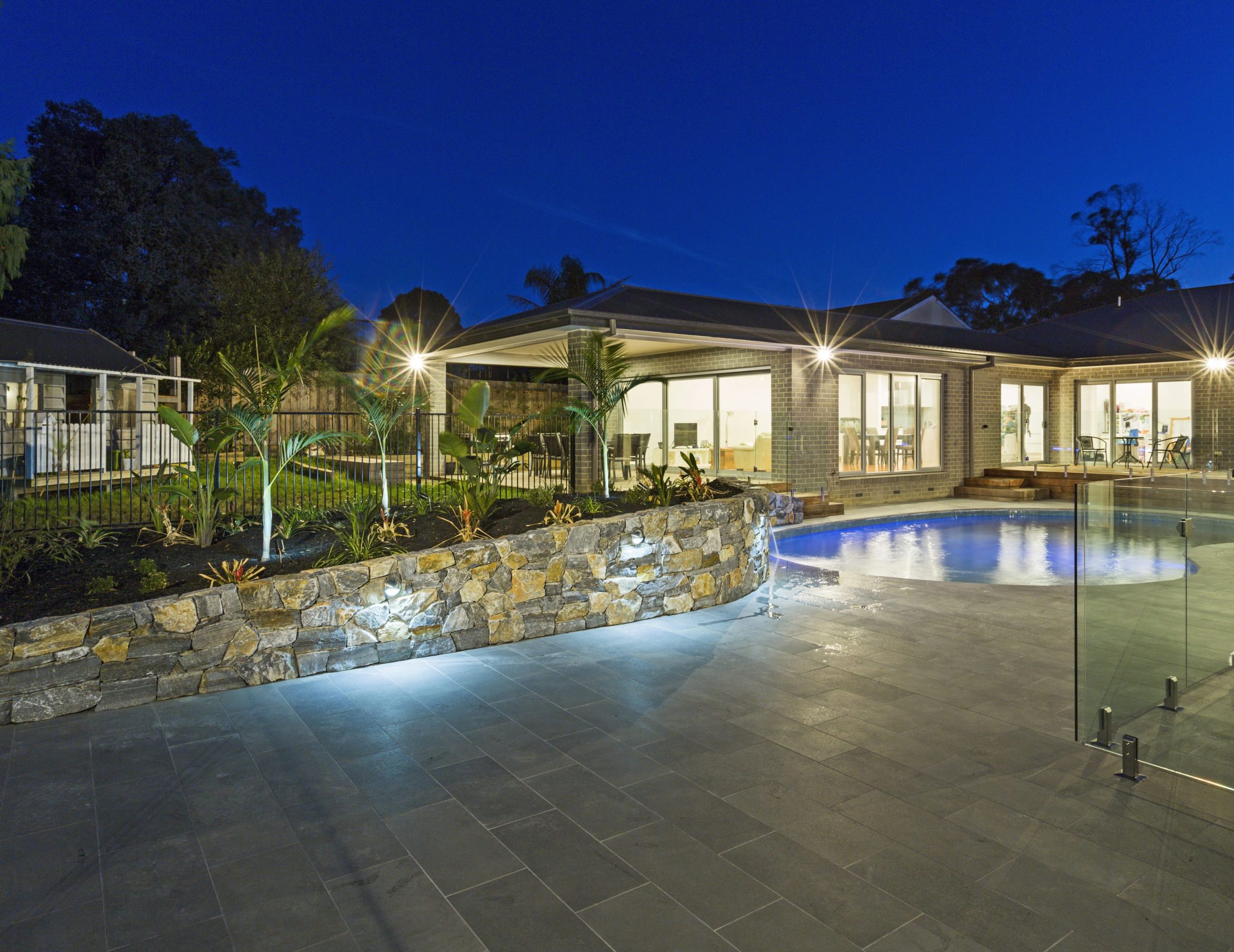 Assisting the landscape architect on designing and constructing the Hillview granite stone rockery and gabion walls, also with the random basalt stepping stones that lead to the vertically aligned spotted gum gates. We assisted the landscape architect on reusing the existing (broken) honeycomb rock water feature feed and using it for our illuminated sheer decent water feature in our newly constructed natural stone clad retaining wall.