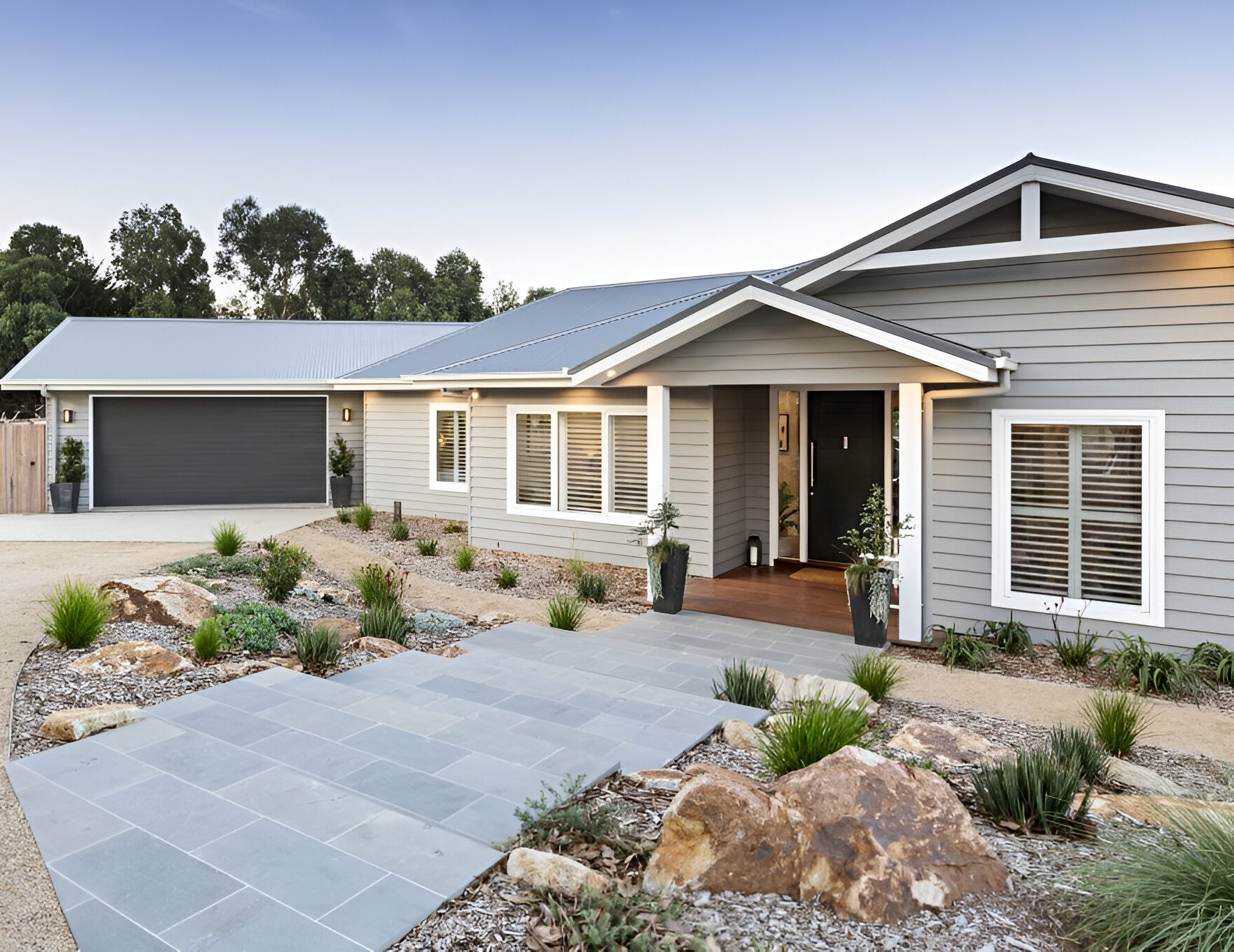 We insisted that an enduring galvanised steel edge would need to be used to define the driveways and pathways close to the house but were happy to use treated pine edging to define the gardens further away from the property. The landscape architect had some difficulty with ideas in diverting the deluge of water that would come down from the neighbouring hill towards our client’s home on heavy rain days, this was an ongoing issue that the original builders could not seem to resolve. After careful planning with the architect we decided to excavate a “cut off” trench 1m deep around the front side of the property so the water would fall into the trench and then be diverted away from the property and out to the natural creek, we installed commercial grade aggi pipes into the bottom of the trench and then fill the trench with drainage material. We are proud to say that our clients no longer experience problems with flooding even throughout the wettest periods of the year.