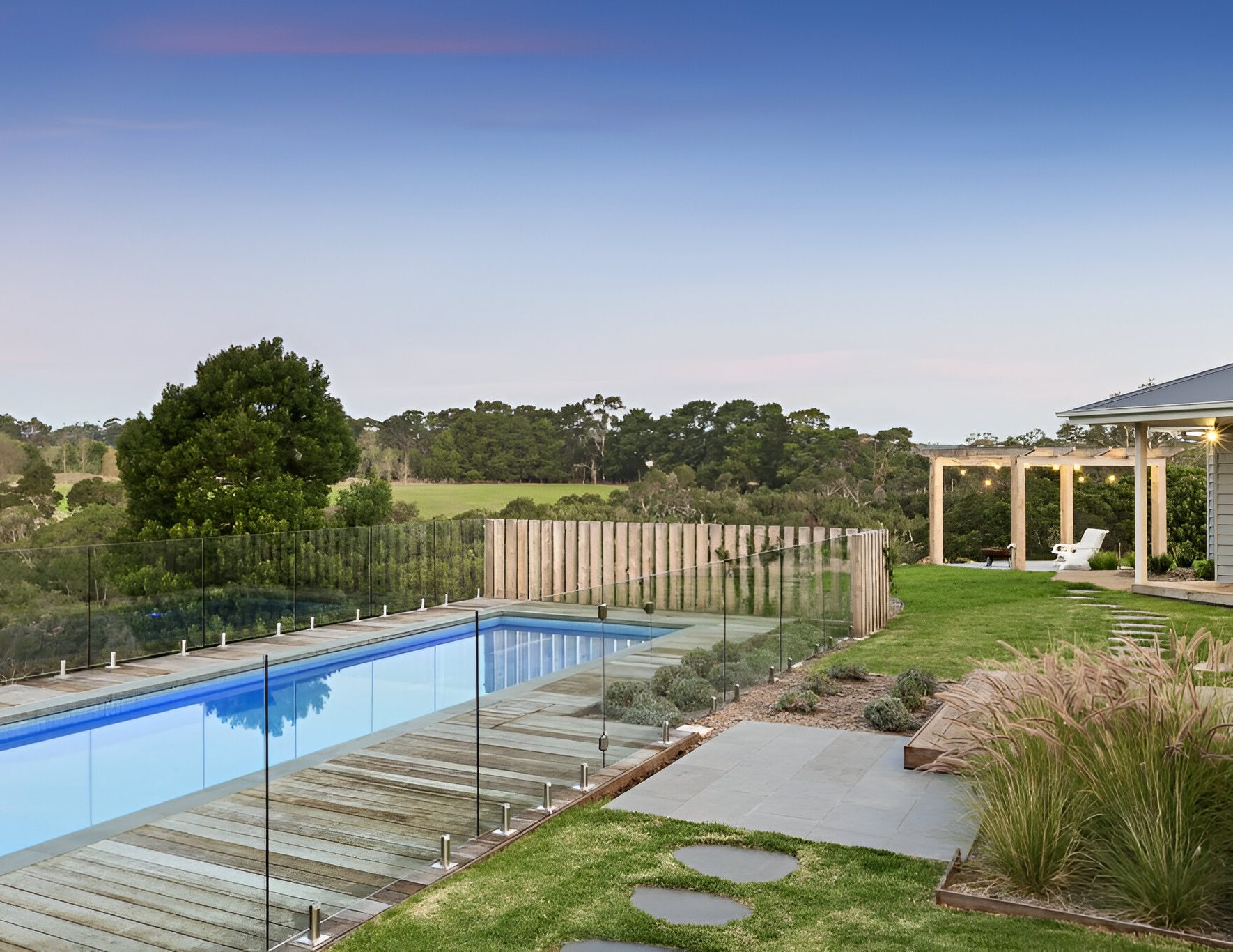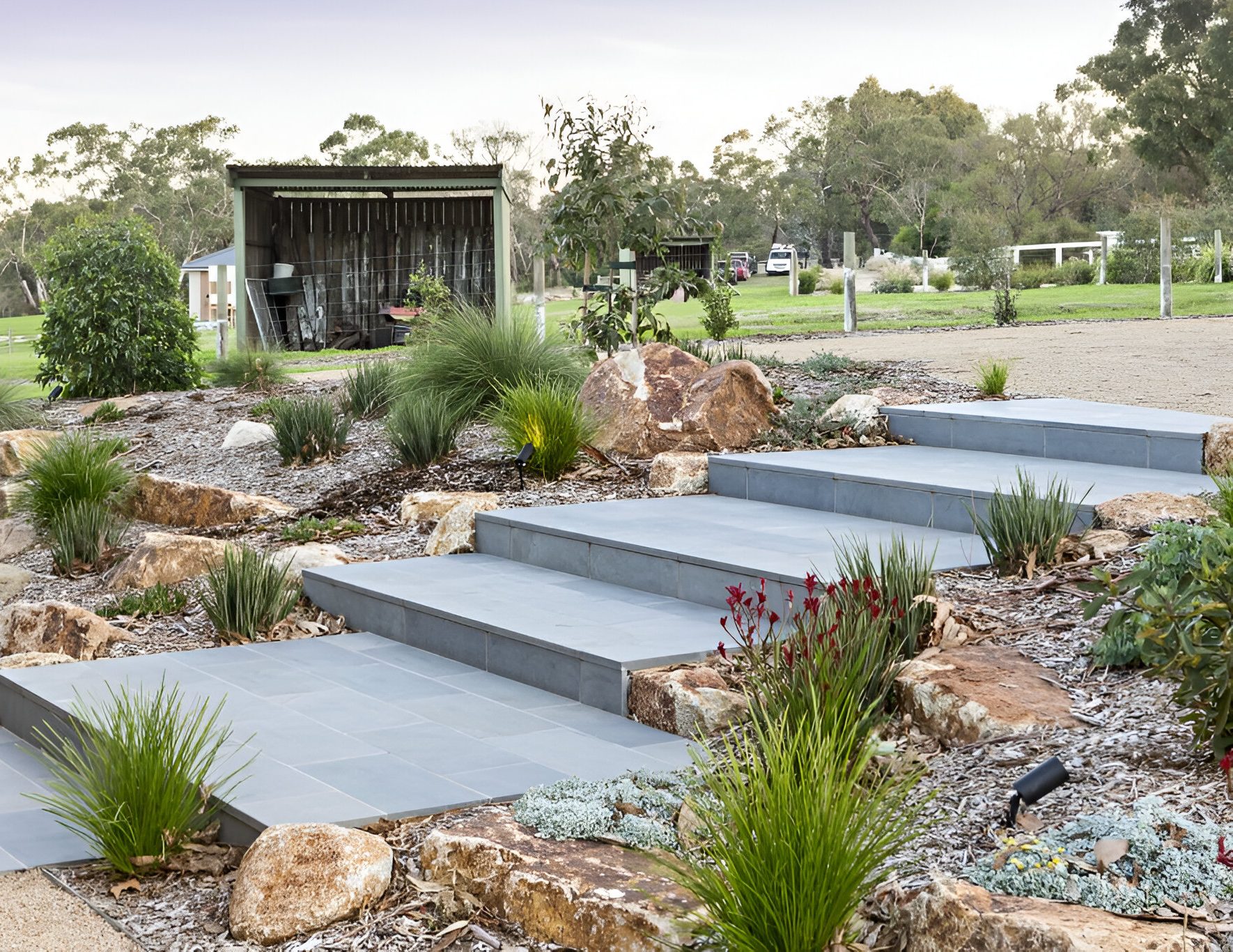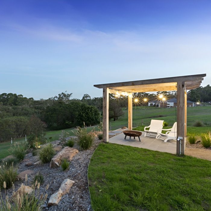 One of the main requests from our client was to somehow provide access and a flowing pathway to the neighbouring nature reserve track. We managed to install a classic Peninsula style farm gate into the boundary fence line with a crushed granite pathway winding around the sloping hills providing direct access from the property to the reserve track. All the native feature trees are illuminated and powered from 1 internal switch which can be easily operated from the kitchen when guest arrive to guide them down the long winding driveway. Feature landing steps and gazebo platforms were laid using a natural 600x300mm sawn bluestone and over 2,500sqm of hydroseed was laid to maintain the rolling green hills after construction of the project.