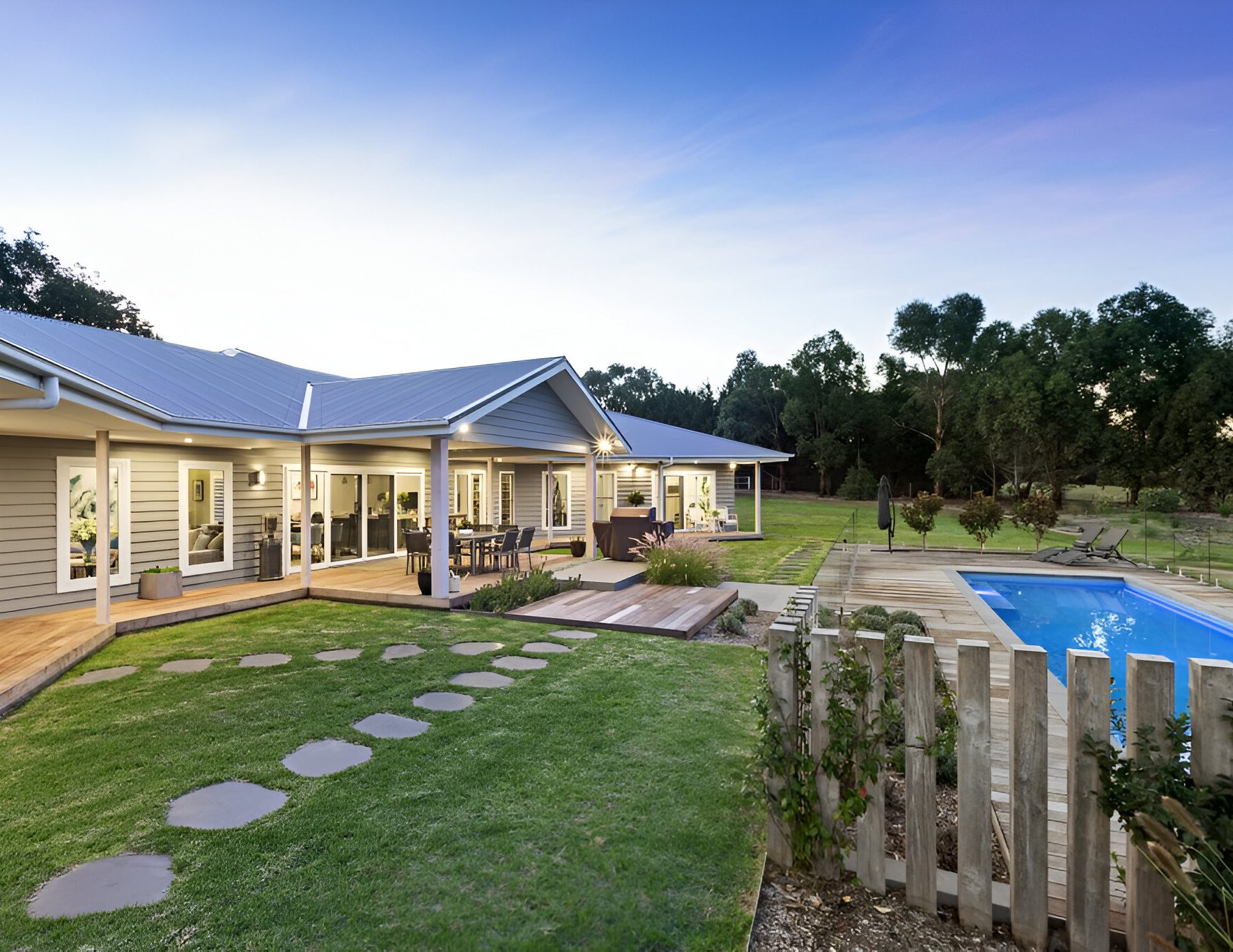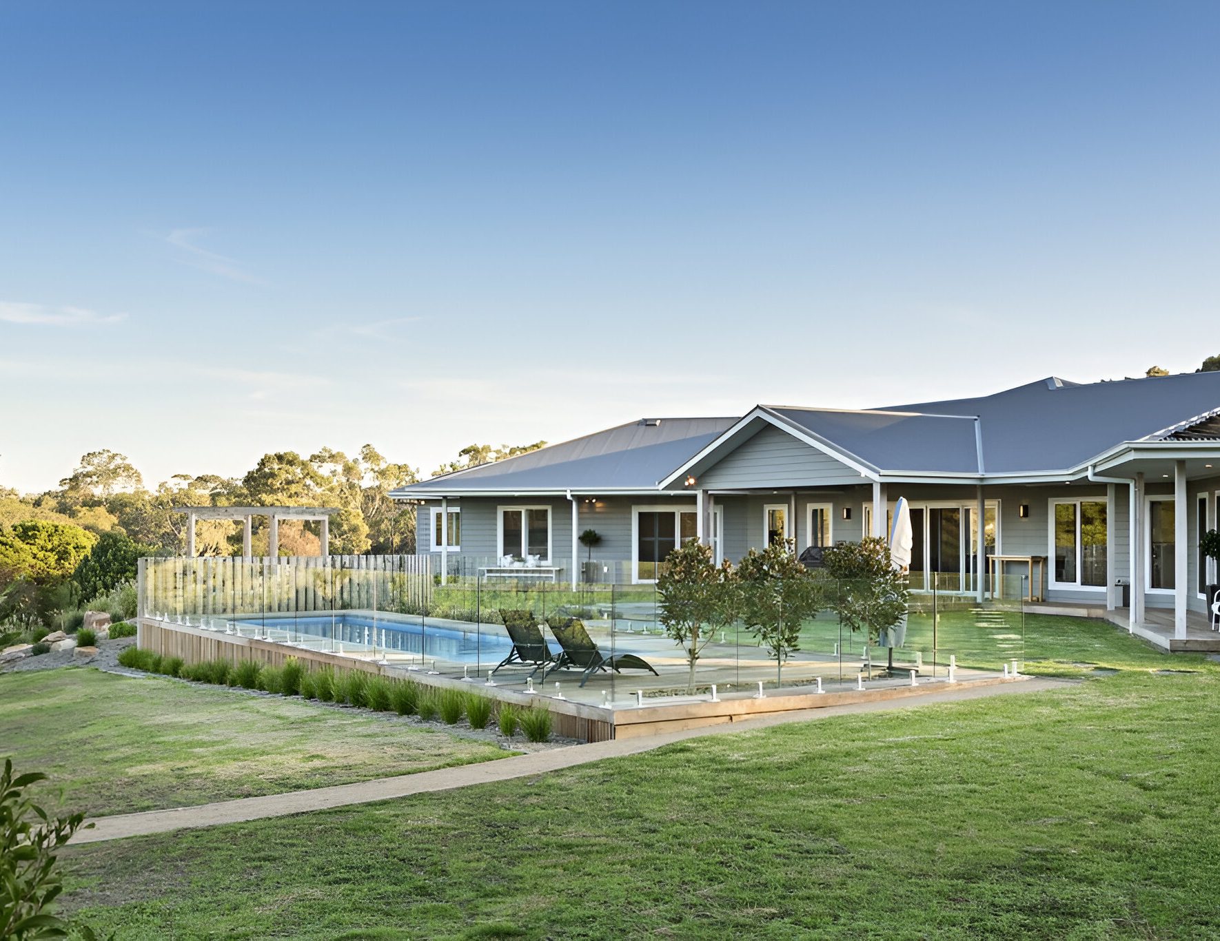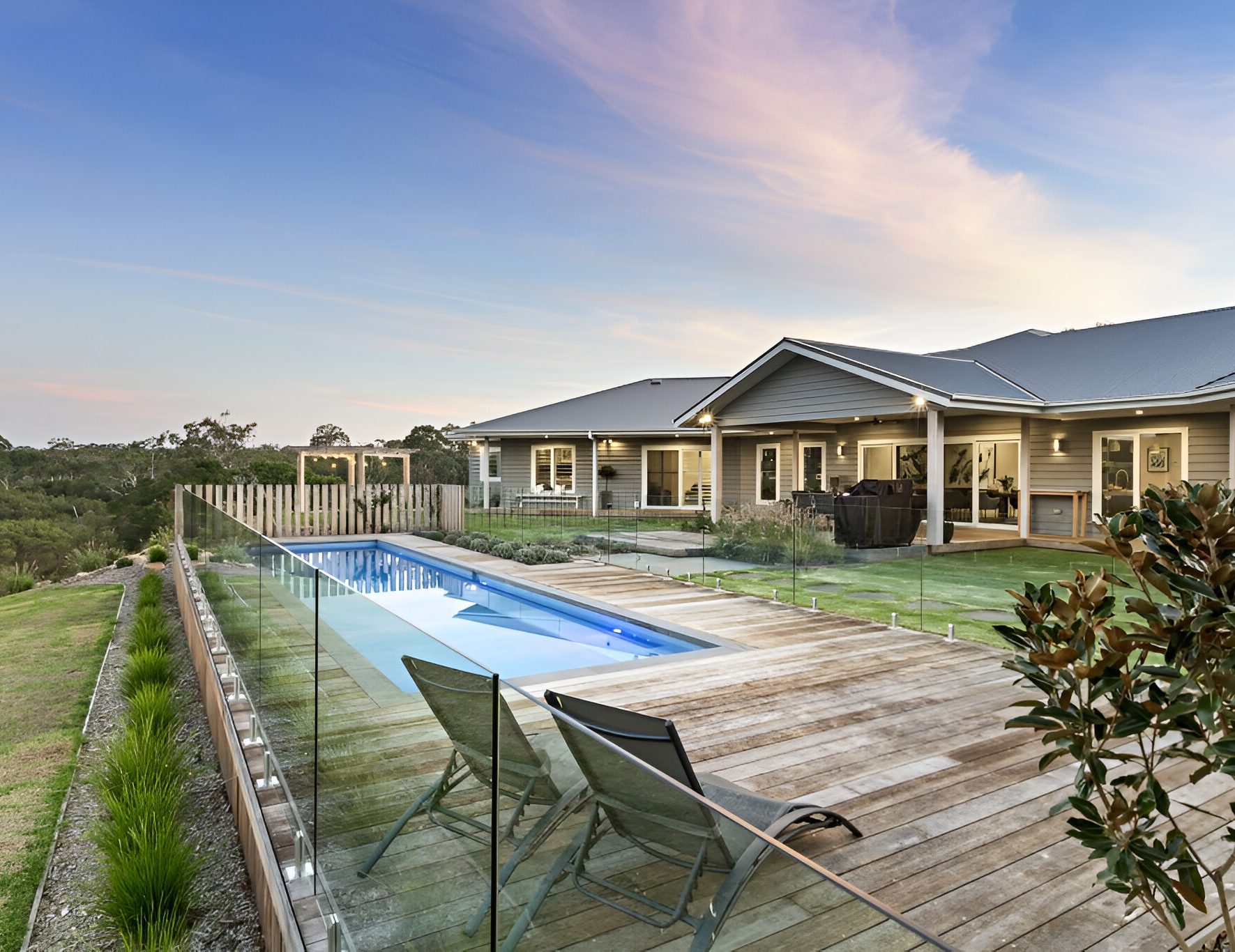 One of the main requests from our client was to somehow provide access and a flowing pathway to the neighbouring nature reserve track. We managed to install a classic Peninsula style farm gate into the boundary fence line with a crushed granite pathway winding around the sloping hills providing direct access from the property to the reserve track. All the native feature trees are illuminated and powered from 1 internal switch which can be easily operated from the kitchen when guest arrive to guide them down the long winding driveway. Feature landing steps and gazebo platforms were laid using a natural 600x300mm sawn bluestone and over 2,500sqm of hydroseed was laid to maintain the rolling green hills after construction of the project.